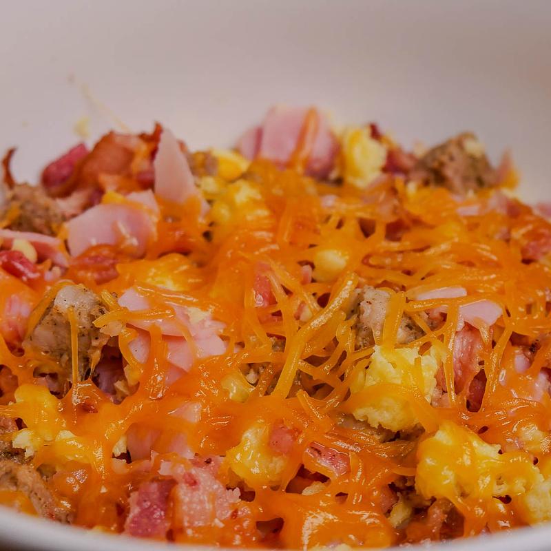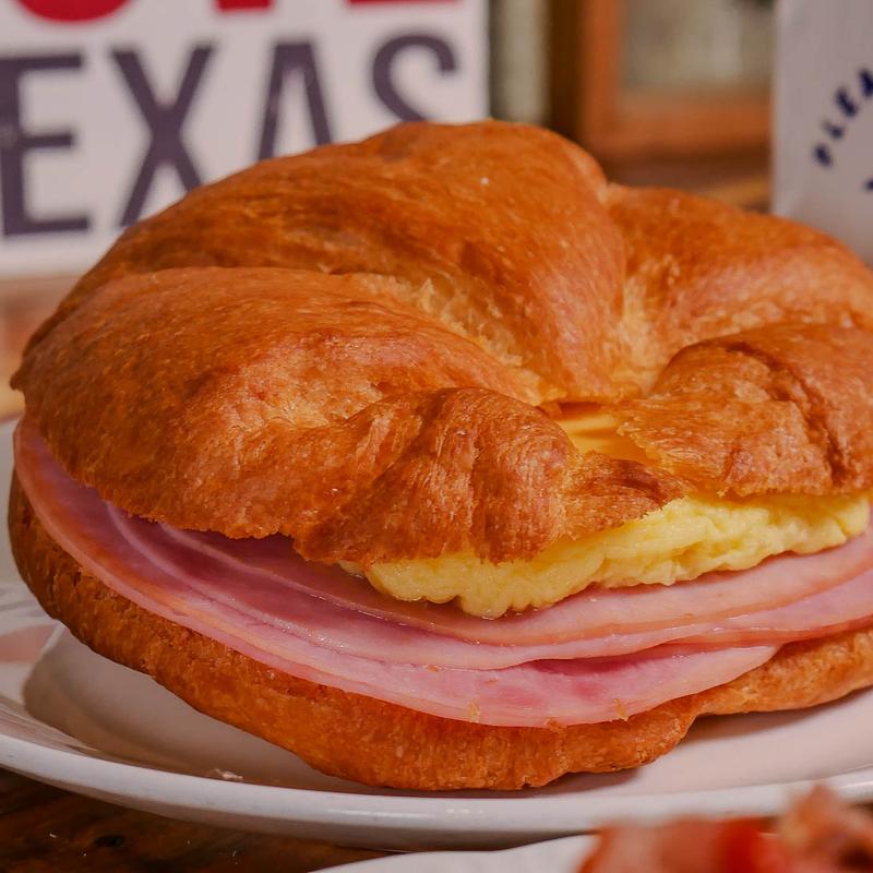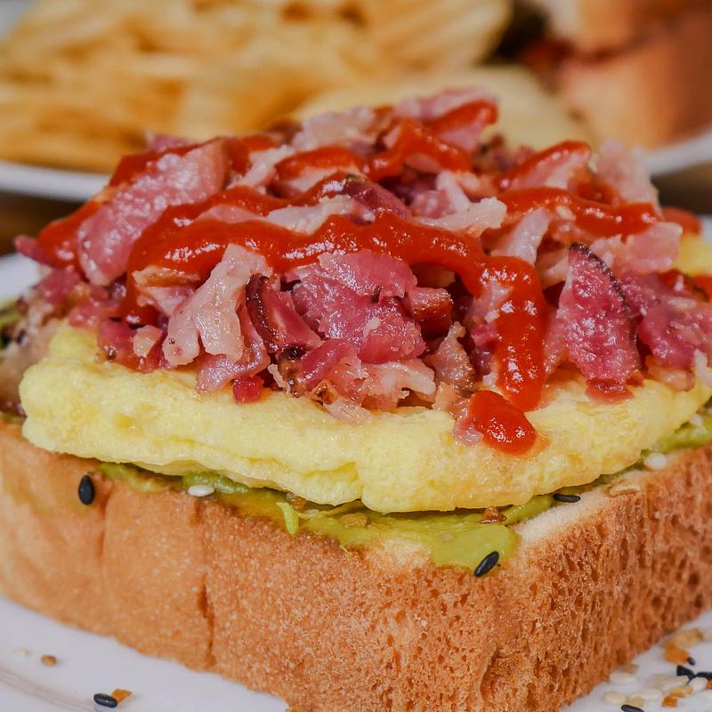 Texas toast topped with avocado, everything seasoning, egg patty, and bacon.
